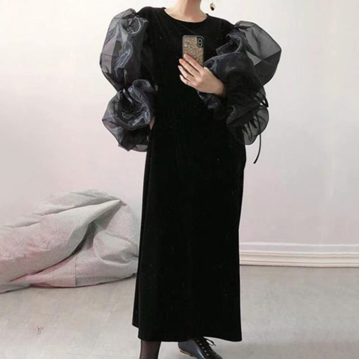 たっぷりパフスリーブのロングドレス。