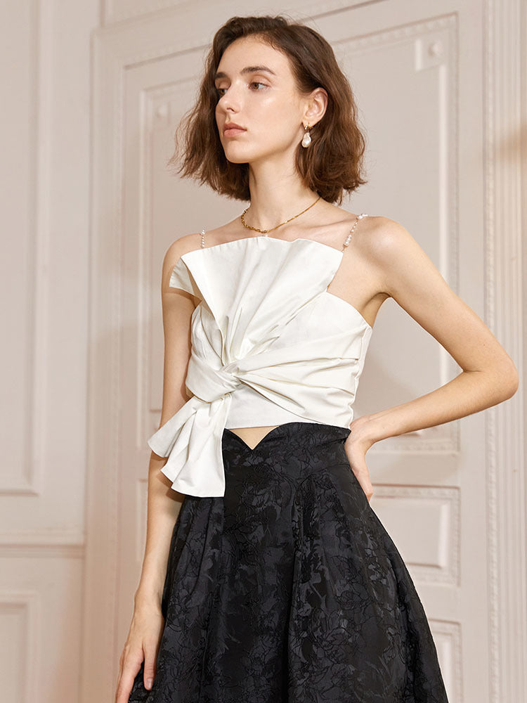 Pleated Bandage Bow Pearl Tank Tops(G2116)
