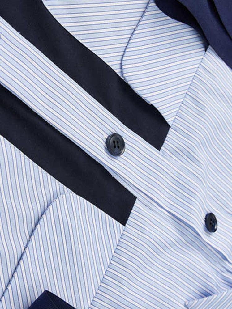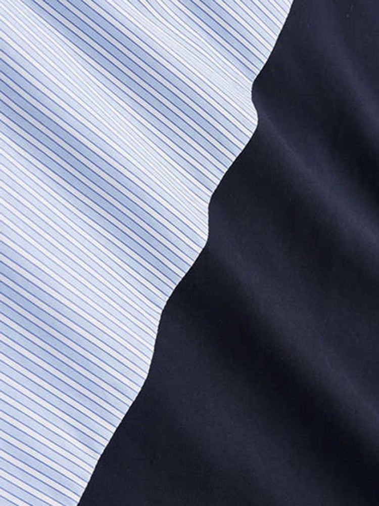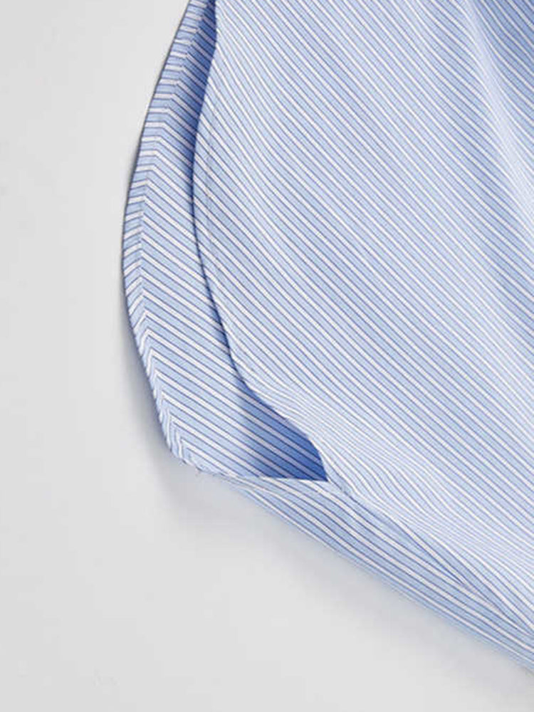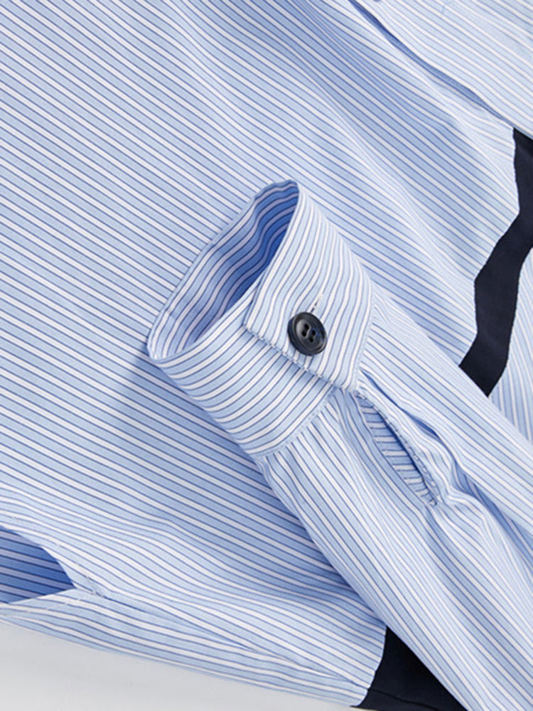 フロント部分に大きなポケットが付いたストライプブラウス。